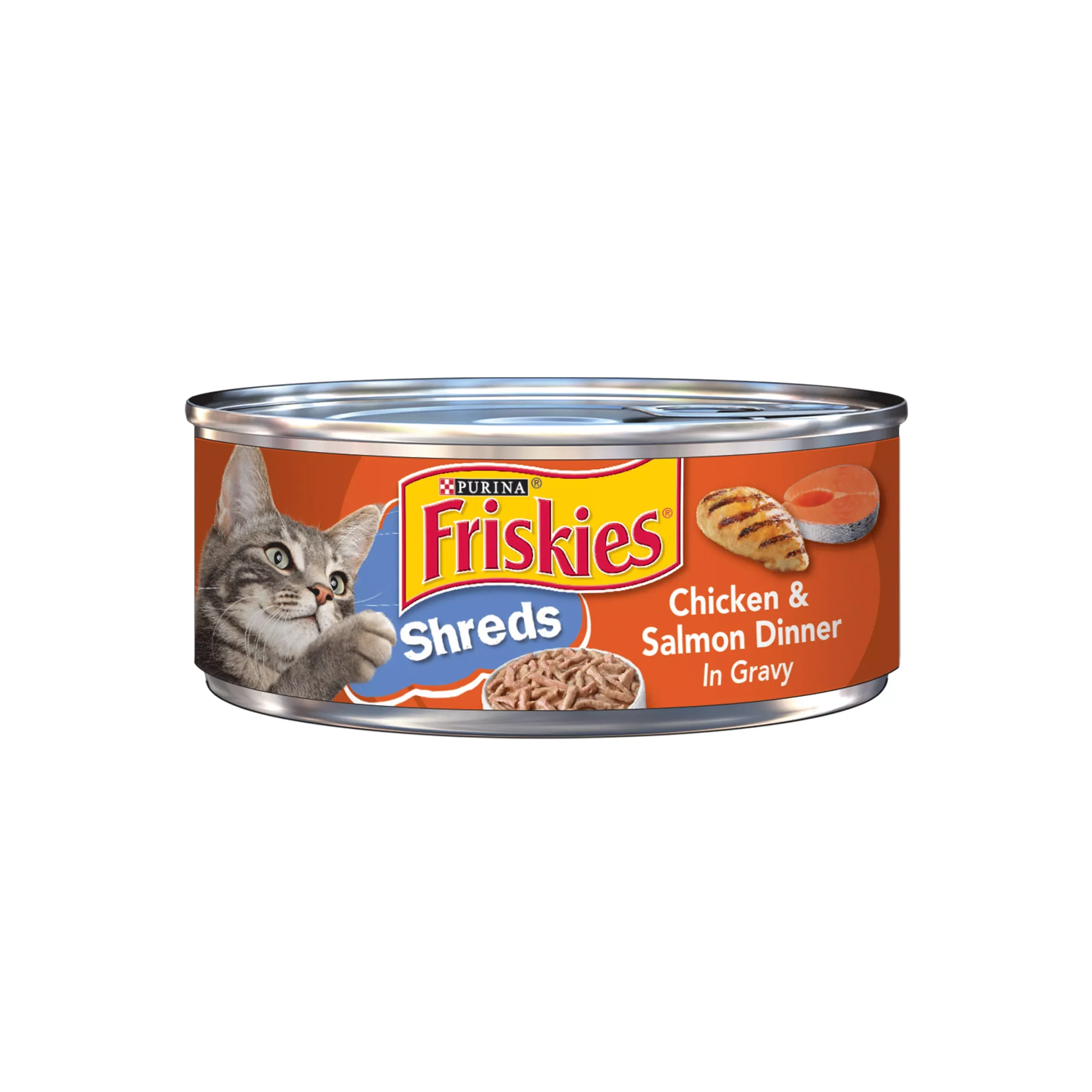 Available in a pack of 24, each 5.5 oz can of Friskies Shredded Chicken and Salmon Dinner offers convenience for pet owners. Perfect for serving at meal times, this product is a reliable source of nutrition and satisfaction for your beloved cats.